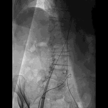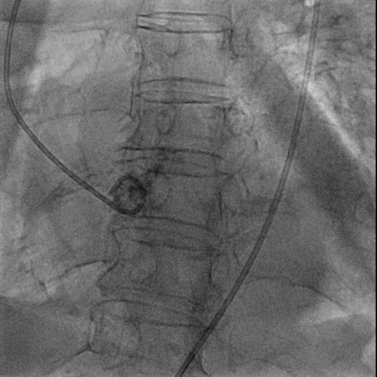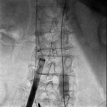 经右股静脉置入7F JR指引导管至下腔静脉,经右股动脉置入6F猪尾导管至腹主动脉,于下腔静脉及腹主动脉同时造影精确定位目标穿刺点。