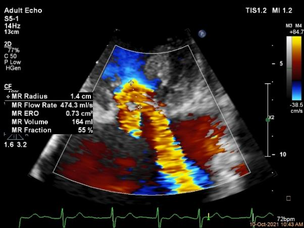 基本情况:77岁女性,患者主因发现二尖瓣反流10余年,喘憋2月入院,患者10余年前于外院体检时发现二尖瓣关闭不全(中度),无喘憋、胸闷等不适,未诊治。2月前出现夜间阵发性呼吸困难,伴双下肢水肿,至当地医院性超声心动图提示:左房77×99×118mm,左室舒张末期内径65mm,EF:55%,二尖瓣前叶收缩时部分脱向左房内,致瓣叶重度关闭不全,诊断为“二尖瓣重度关闭,心脏扩大,心力衰竭”,予规律药物治疗后,上述症状有所改善,但仍间断出现活动后胸闷、气短症状,为进一步诊治收入院。