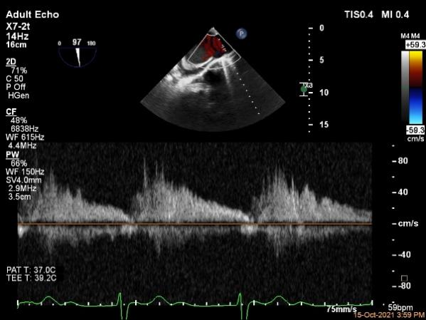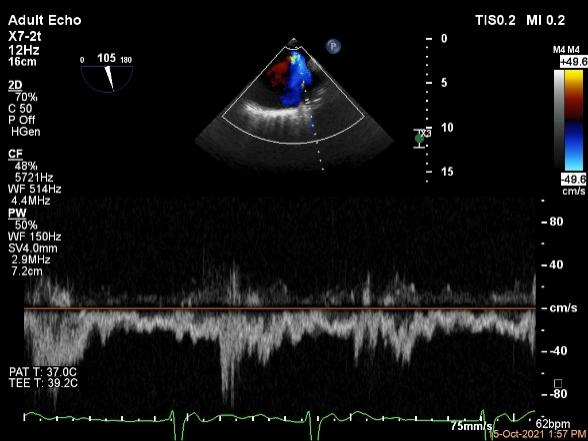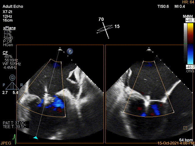 患者麻醉方式为全麻,建立静脉通路后,穿刺右侧股静脉,预埋ProGlide缝合器,食道超声指导下房间隔穿刺成功,将Superstiff导丝送至左房,应用18F鞘管扩张穿刺部位,沿导丝将导引导管送入左房,MitraClip调整后顺利到达二尖瓣目标位置,在食道超声辅助下,将Mitraclip XTR成形夹精确定位后,成功夹合二尖瓣A1-P1区,超声显示P1区内侧残余Flail及返流,将第二枚Mitraclip XTR成形夹精经输送系统送入左房并确定位2区后,成功夹合二尖瓣A2-P2区残余Flail,整体反流量改善至少2级以上,后多切面证实夹合组织充分,肺静脉多普勒波形由反向恢复正常,手术顺利结束,安返普通病房。