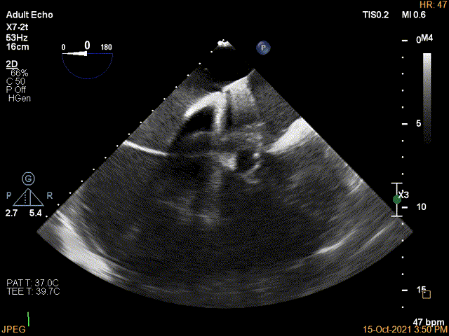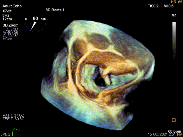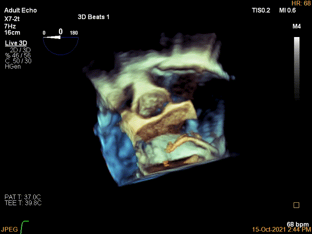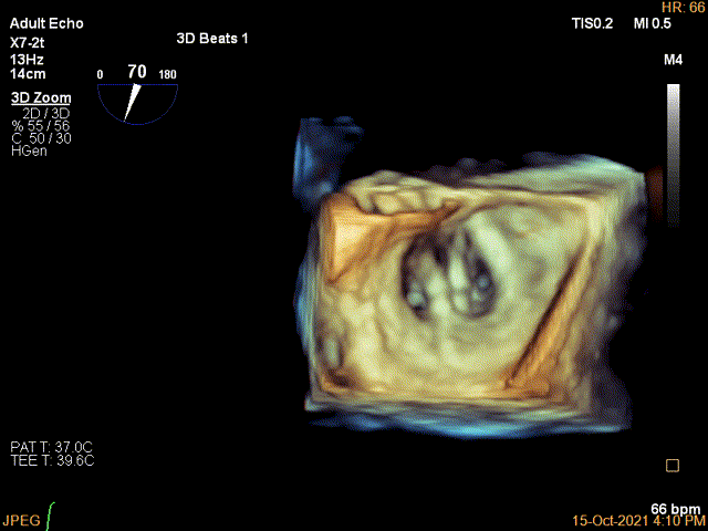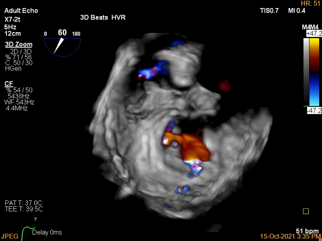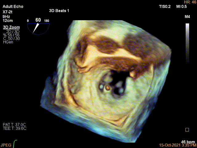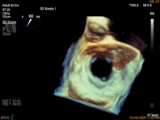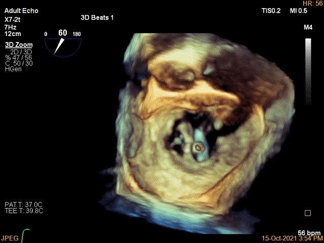 (2)该患者双房明显扩大,空间结构出现了扭转,在Bi-Plane平面LVOT view看不到左室流出道,因此术中通过3D zoom将主动脉瓣旋转到12点钟方向 ,穿刺位置最好为3点钟,自内交界区上方较合适,确定穿刺高度后,左心房3D成像确认。因此,对于这类患者结合3D视图找到最合适的房间隔穿刺点是成功的关键。