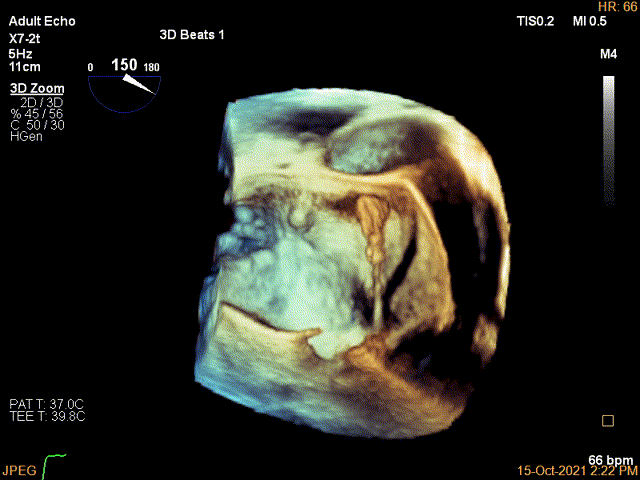 (4)两个夹子尽量靠近,保持平行,在TEE 3D view和DSA 切线位确认夹子靠近的位置 和同向,瓣膜没有异常的抖动,证明张力合适,clip位置满意。