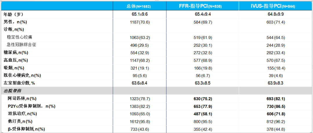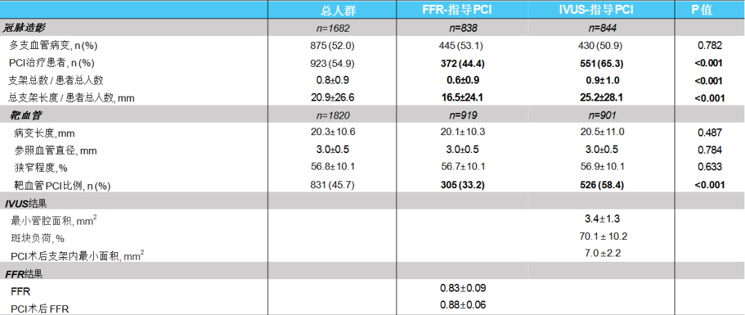 对于首次发现冠脉中度狭窄(40-70%)拟行PCI治疗患者,被随机分配至FFR-指导PCI组和IVUS-指导PCI组,PCI治疗指征为,FFR-指导PCI组:FFR≤0.80;IVUS-指导PCI组:最小管腔面积(MLA)≤3mm2或3 < MLA ≤4mm2 &斑块负荷>70%。优化PCI治疗指征为,FFR-指导PCI组:PCI术后FFR≥0.88或PCI术后∆FFR (支架内外FFR) < 0.05;IVUS-指导PCI组:支架边缘斑块负荷≤55%支架内最小面积≥ 5.5mm2或支架内最小面积≥远端参考血管面积。
