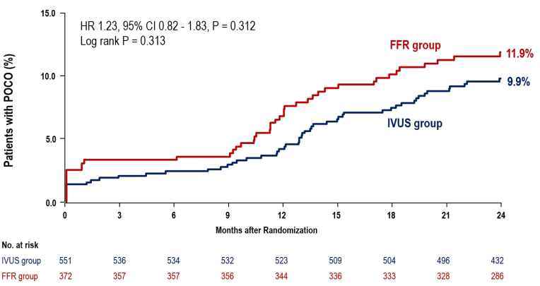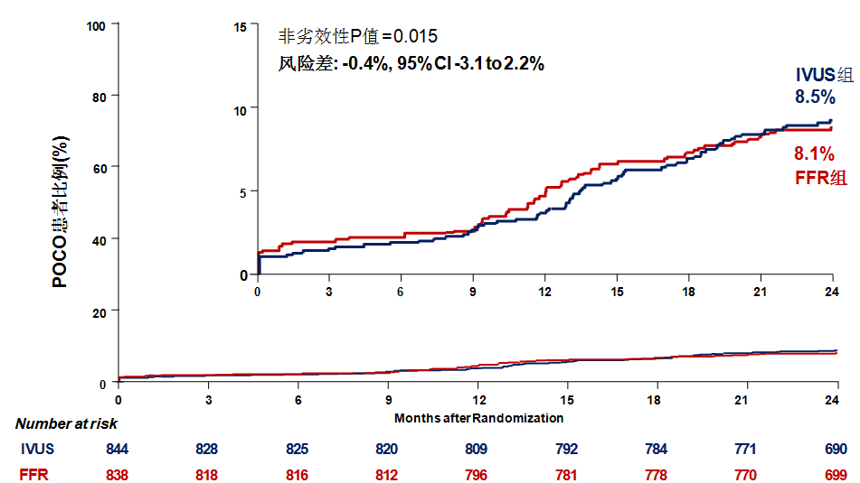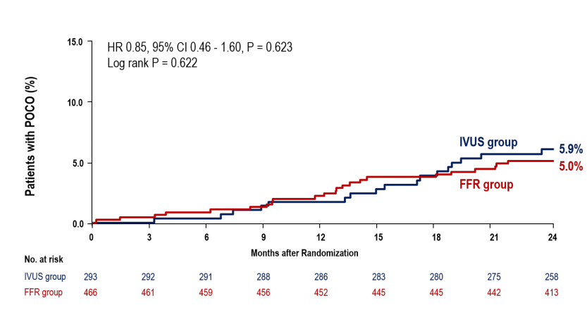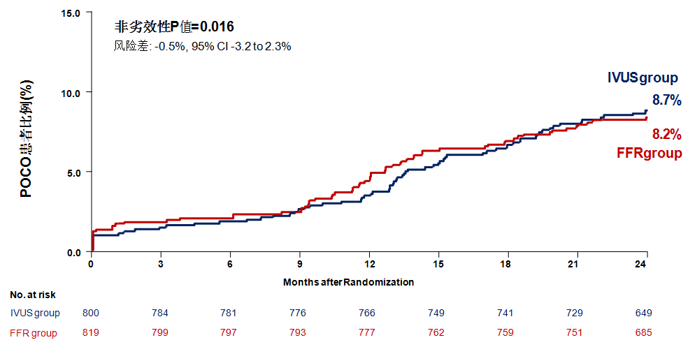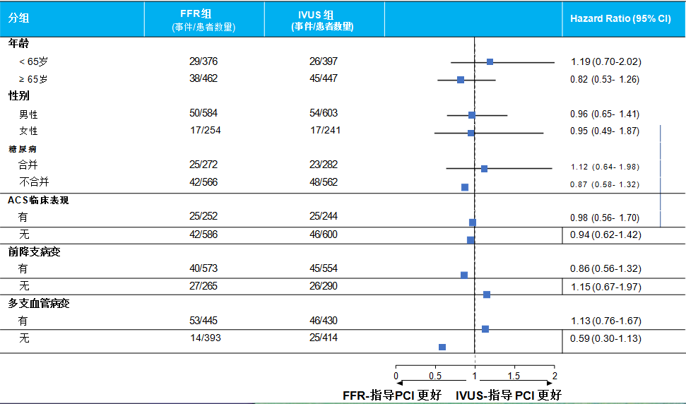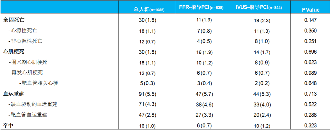 1.在预防PCI术后24个月内全因死亡、心肌梗死和血运重建的复合终点事件方面,FFR指导的PCI不差于IVUS指导的PCI。