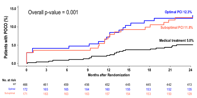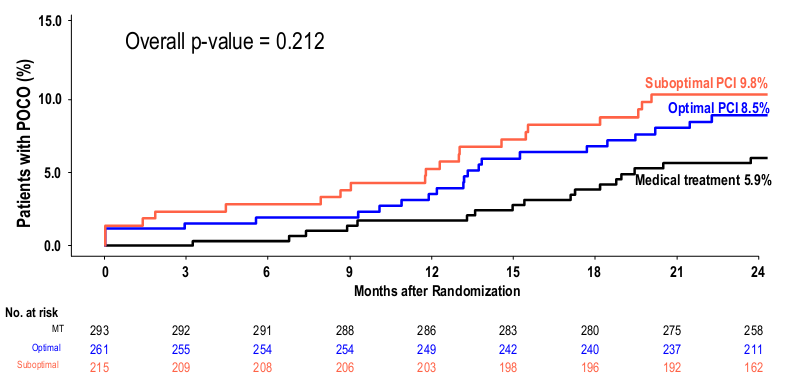 研究终点包括,主要终点: 术后24个月以患者为中心的复合终点 (POCO),包括术后24个月内的全因死亡、心肌梗死(MI)和再次血运重建。次要终点:主要终点中的单个事件、支架植入数量、卒中以及西雅图心绞痛问卷(SAQ)评分。