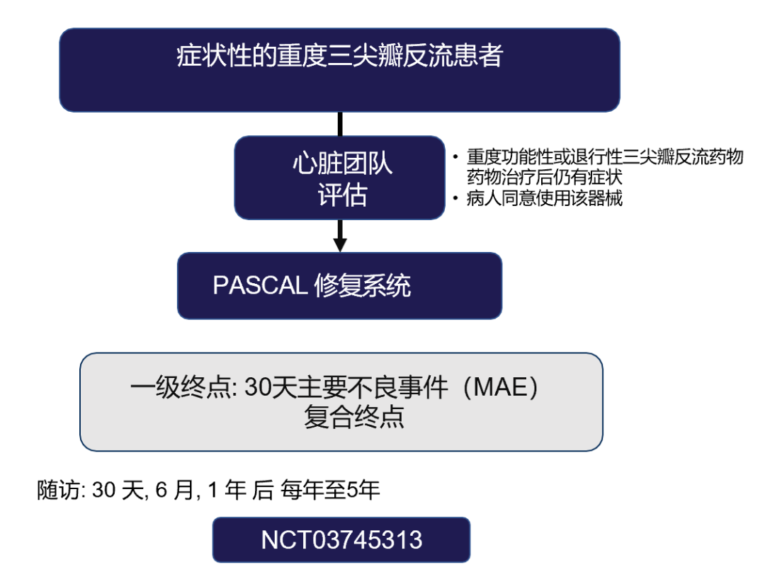 三尖瓣反流临床常见,预后较差,药物治理效果欠佳。三尖瓣病变的病因复杂,可分为原发性,继发性。2021年美国ACC/AHA瓣膜病指南提出对于无症状或者轻度症状的原发性重度三尖瓣反流合并右心室扩张改变的,可以考虑外科治疗。对于重度继发性三尖瓣反流(有或无既往左心系统瓣膜手术病史),若无明显的右心或左心功能不全,无严重肺血管疾病或肺动脉高压可以考虑外科治疗(IIa推荐),对于无法外科手术的症状性三尖瓣反流患者可以考虑在经验丰富的心脏中心进行经导管介入治疗(IIb推荐)。CLASP TR研究为前瞻性,多中心,单臂研究,旨在评估PASCAL瓣膜钳夹系统在重度三尖瓣反流患者中的安全性及有效性。