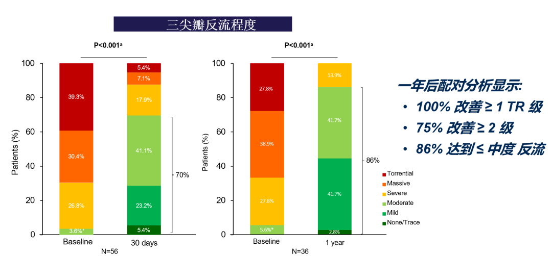 Greenbaum教授介绍1年随访数据显示,PASCAL经导管瓣膜修复系统显示出较高的存活率,三尖瓣返流(TR)显著且持续减少,临床、功能和生活质量均有改善。