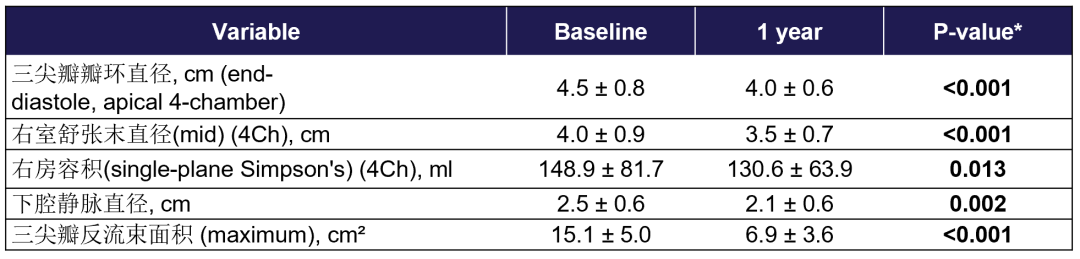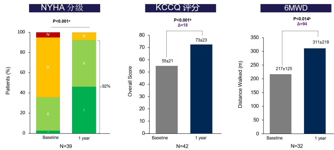 统计分析显示,Kaplan-Meier分析显示,1年时存活率为87.9%,无因心力衰竭再住院率为78.5%。11名患者(16.9%)经历了主要不良事件,而92%(p<0.001)的患者心力衰竭严重程度显著改善,达到纽约心功能分级I/II级。在6分钟步行测试中,患者的平均步行距离增加了94米(p<0.001),生活质量(通过堪萨斯城心肌病问卷评分)平均提高了18分(p<0.001,同时评估右心系统的超声参数已有明显改善。(图十、十一)