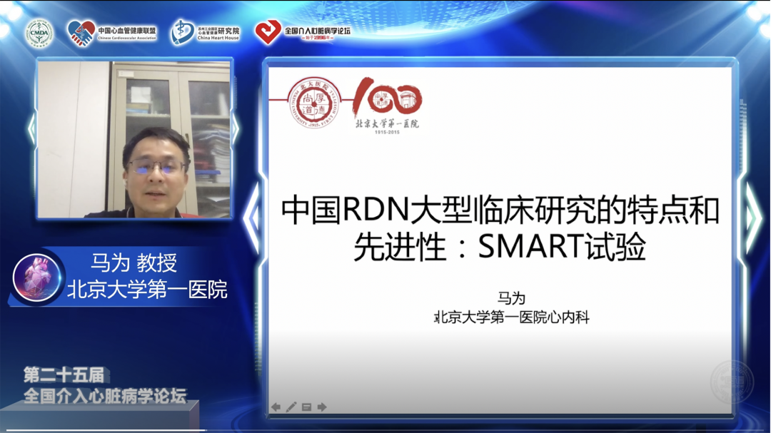 马为教授从血压控制的意义以及降压治疗的依从性现状入手,对RDN相关系列研究的方案、结果以及不足进行了详细解读,指出RDN临床研究需要解决的关键问题包括与手术/器械有关(盲目消融时研究失败的关键,操作困难)、与药物/受试人群有关(药物变化/药物依从性,目标人群);进而对SMART研究的背景、设计、特点进行充分说明,指出降压治疗是降低心血管事件的重要手段;现有生活方式改善/药物治疗,由于治疗依从性、患者意愿等存在临床未被满足的需求;RDN是治疗高血压的有效补充,可能具有降压外的多效性以及靶器官保护作用,SMART研究采用独特的肾神经标测/消融的方法,双终点设计、运用质谱法进行尿液药物监测评估患者服药依从性,具有三大先进性:选择性精准去除肾交感神经,保留副交感神经,术后鲜有患者血压上升,降压效果更为显著;消融点数少,肾动脉主干只需消融4-5点,符合介入手术中“Less is More”的原则。