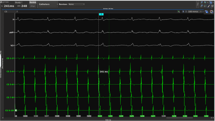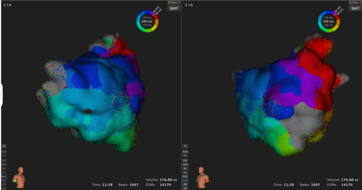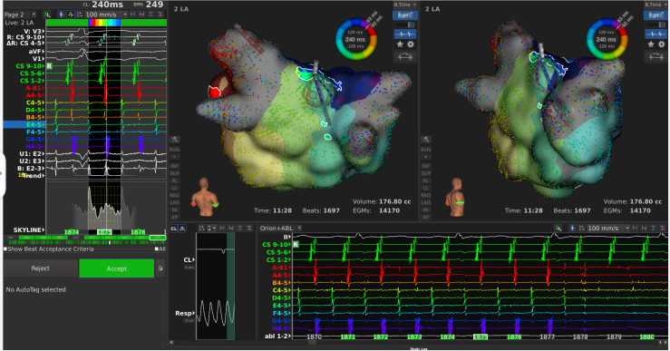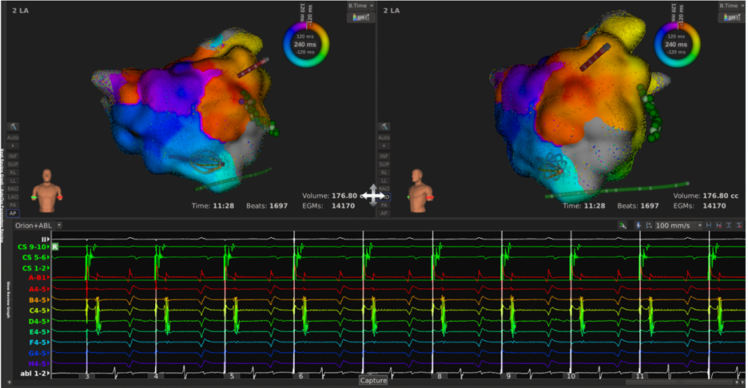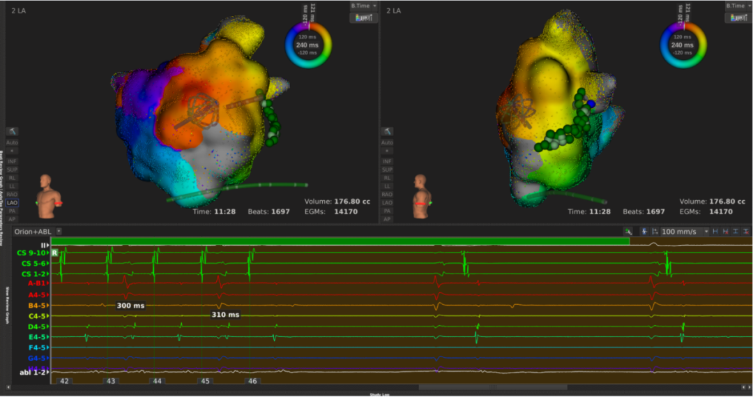 患者上台常规消毒铺巾,心电图显示心房扑动,周长为240ms,穿刺后,先行右房标测,标测结果显示最早激动点由冠状窦口传出,右房整体激动时间占心动过速周长约1/2。遂穿刺房间隔至左房,左房标测结果可见该心动过速绕二尖瓣进行折返,切换电压基质图可见顶部线已断,前壁线区域部分恢复,疤痕部分参与传导。遂先行消融前壁线,以40w 43℃功率模式放电,放电过程中平均单点阻抗下降约25Ω。至前壁线消融结束,心动过速周长延长至260ms. 再行消融二尖瓣峡部线,自瓣环拉至左下肺静脉过程中,DIRECTSENSE™局部阻抗监测技术显示单点阻抗下降约12Ω,心动过速周长逐渐延长至300ms,消融左下肺静脉口蓝点处,心动过速终止。巩固消融后,起博验证,二尖瓣峡线隔离成功。反复burst刺激诱发未见心动过速,本次手术结束。整台手术仅历时90分钟,病人术后感觉良好。