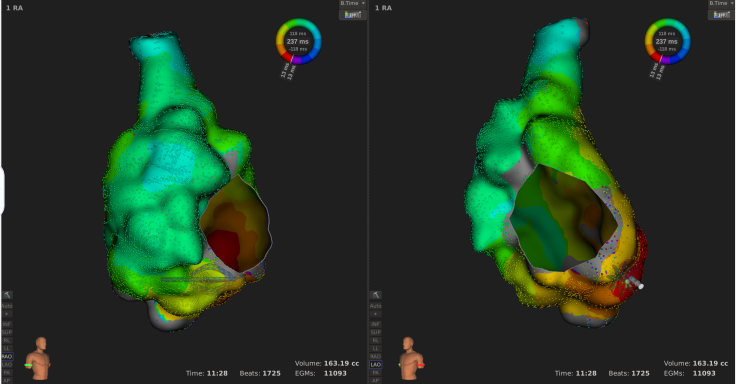 患者周某某 ,女,66岁,浙江玉环人,左侧小脑半球梗死史4年。高血压10余年。曾于2017年做过房颤射频消融术,患者首次房颤消融术曾消融两侧肺静脉、顶部线、前壁线。此次“发现心房扑动20余天”,经过与亲友商量一番,慕名来到温州医科大学附属第二医院寻求李岳春主任团队治疗。由于病人病情复杂,沟通过后决定用先进的Rhythmia标测系统进行手术。