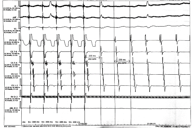 图1:双侧环肺静脉电隔离后转为房扑(房扑周长220ms)