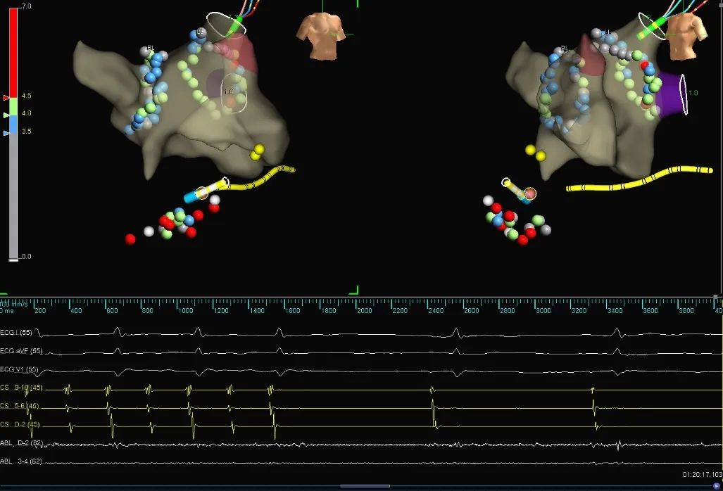 使用HD Gird重建左房三维模型,左房基质良好,首先完成肺静脉电隔离术(图1)。双侧肺静脉电隔离后,房颤转为房扑,经拖带标测提示为右房峡部依赖性房扑(图2),行三尖瓣峡部线性消融,消融过程中房扑终止转为窦性心律(图3),术后患者稳定窦性心律(图4)。
