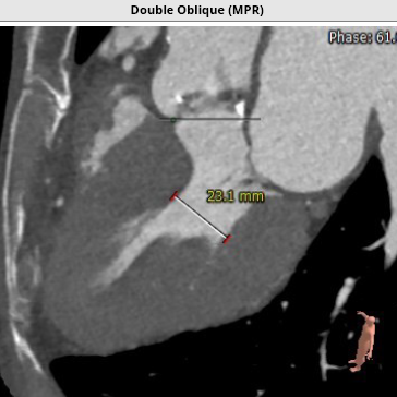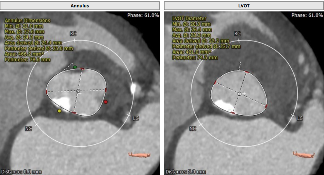 超声心动图显示,主动脉最大流速482cm/s,最大压差93mmHg,平均压差50mmHg,LVEF65%。CT显示主动脉瓣为TYPE2型二叶瓣,严重钙化,右无、左无可见粘连伴钙化,瓣环平面可见钙化,钙化延伸至流出道及二尖瓣前叶根部,左冠高度约12mm,瓣叶长度14.9mm,存在一定左冠风险,法式窦平均直径33.7mm,STJ高度约21.8mm、直径约30.2mm。