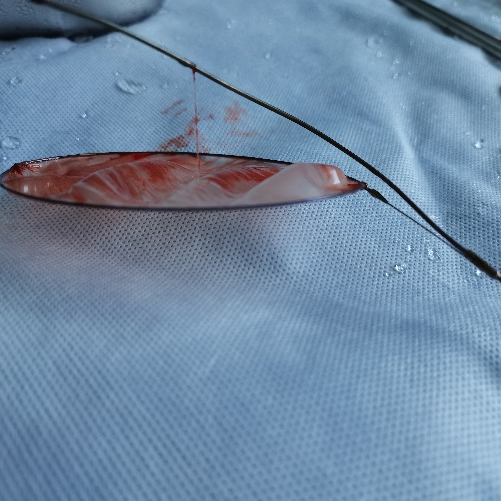 主入路选择20mm预扩张球囊,在起搏器调至180次/分条件下球囊于主动脉瓣膜处进行扩张,扩张效果较满意,球囊可见腰征,无明显反流,左冠显影欠佳。根据预扩情况,决定Downsize选择23号瓣膜,沿Lundquest加硬导丝送入VenusA Plus 23号主动脉瓣膜,起搏器调至180次/分,平稳释放瓣膜。瓣膜释放后主动脉根部造影及冠脉选择性造影提示冠脉通畅,血流TIMI3级,瓣膜位置良好,形态欠佳,同时超声提示存在少-中量周漏,遂使用20mm球囊进行后扩张,扩张后超声显示瓣上最大流速由术前482cm/s,降低至181cm/s ,最大压差由83mmHg降低至13mmHg,平均压差由50mmHg降低至7mmHg,瓣膜形态及位置良好,无瓣周漏。成功撤出 TriGUARD3脑保护装置,并捕获两块脱落组织。手术过程顺利,患者生命体征平稳,手术过程几乎无任何出血。
