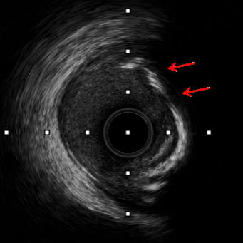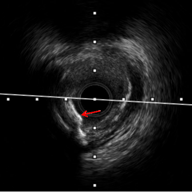 术中IVUS检查提示患者左回旋支近远段多处偏心钙化及钙化小结,钙化较重,导致多种介入器械难以通过,因此启动Shockwave冲击波球囊技术方案。
