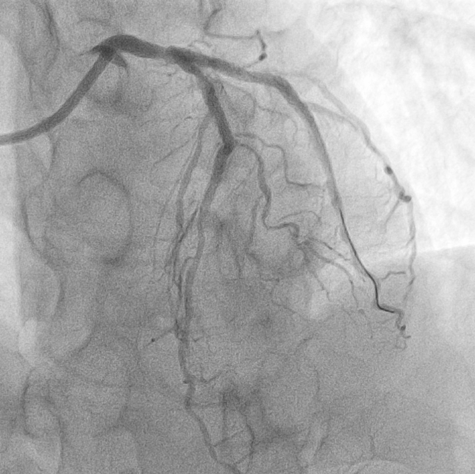 患者为一位72岁老年男性,既往有冠心病 PCI术病史2年,有“高血压病、2型糖尿病”病史10余年,此次因劳力性心绞痛症状入院,复查冠脉造影显示,左回旋支中远端可见约80-90%弥漫性重度狭窄,血管迂曲且合并有严重钙化,使用QFR评估此靶血管为0.45,需要进一步介入干预。