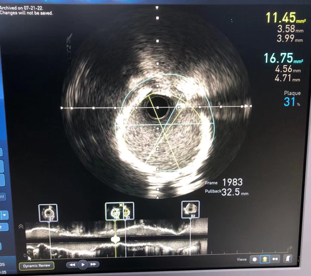 整个手术期间患者无明显不适,心电图可见一过性机械电耦合现象(属于正常现象),未见明显低血压、ST改变及持续性心律失常,复查造影及血管内超声可见前降支-左主干钙化狭窄明显改善。顺利植入两枚药物支架,复查造影及血管内超声可见支架膨胀良好,贴壁良好,术后支架内最小管腔面积达到11.45mm²,手术效果理想,术后患者胸痛症状得到明显缓解。