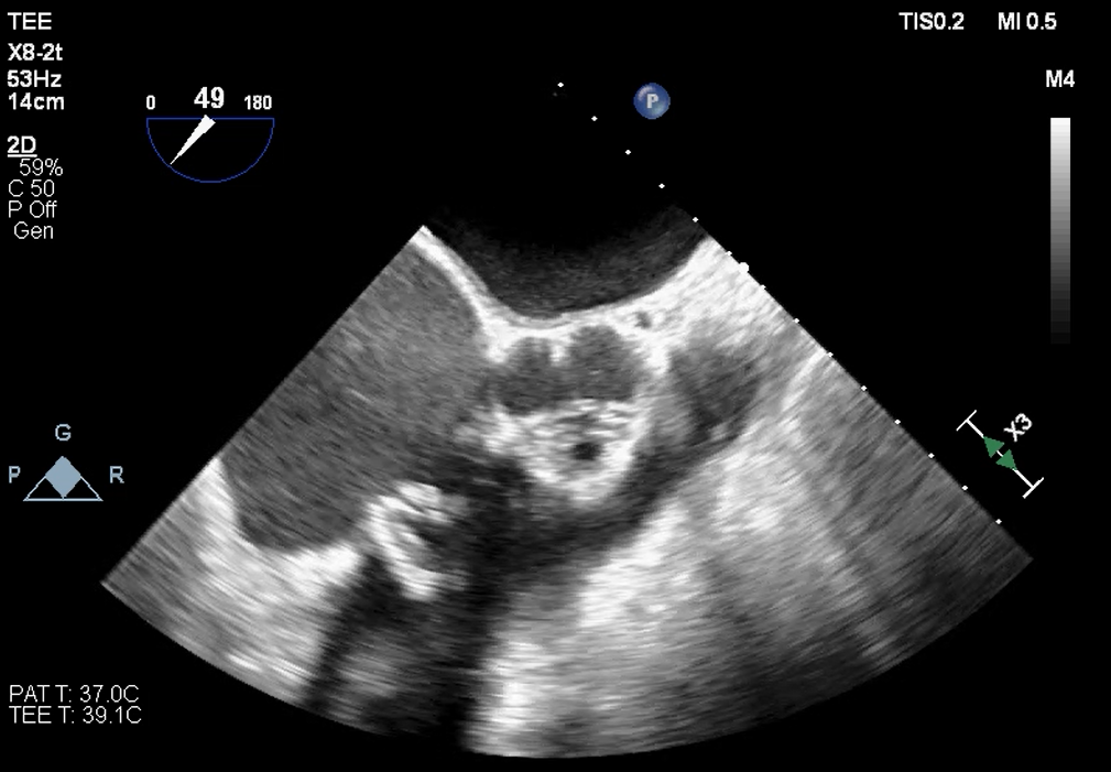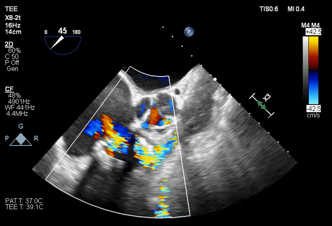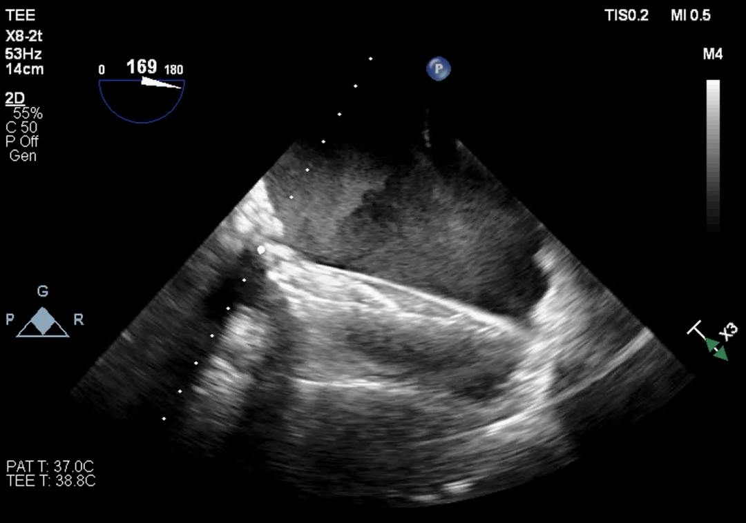 男性,胸闷气急30年,15年前因二尖瓣前叶脱垂、穿孔伴重度二尖瓣反流,同时三尖瓣增厚伴重度反流,接受了二尖瓣机械瓣置换术+三尖瓣生物瓣置换+左心耳封堵。有高血压史8年余。6月前无明显诱因下出现胸闷,1个月前加重,经诊断为三尖瓣关闭不全。入院后接受了起搏器植入手术。