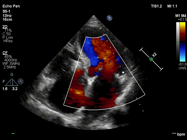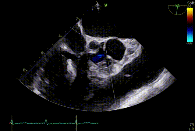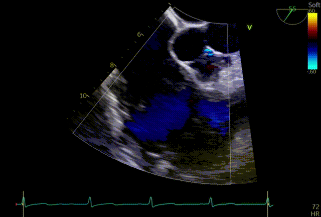 3DTEE显示双房及右室扩大(RA52mm×50mm;RV31mm);左房及左心耳未见附壁血栓;左室下壁基底段运动减弱;三尖瓣环左右径38mm,三尖瓣前叶长度24.5mm,后叶 长度25.7mm,三尖瓣隔叶长度15.7mm,三尖瓣后隔gap3.1mm;前隔gap2.3mm,三尖瓣 TAPSE16mm;余各瓣膜回声纤细柔软,开放幅度正常;未见心包积液。2、彩色及频谱多普勒显示:收缩期三尖瓣口反流束主要来源于前隔交界,前隔交界反流束缩流颈宽度6.7mm,后隔交界反流束缩流颈宽度5.8mm;舒张期三尖瓣口平均跨瓣 压差1mmHg;收缩期二尖瓣口可见微量反流信号;舒张期主动脉瓣口反流束缩流颈宽 度3.0mm;PAPs35mmHg。