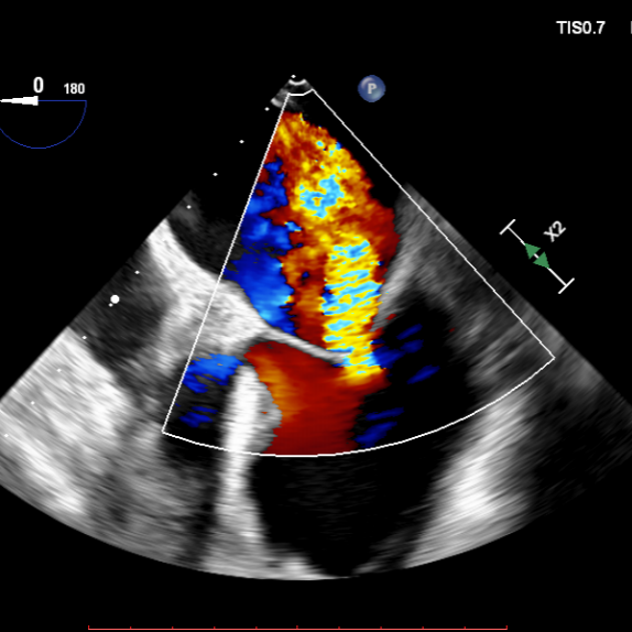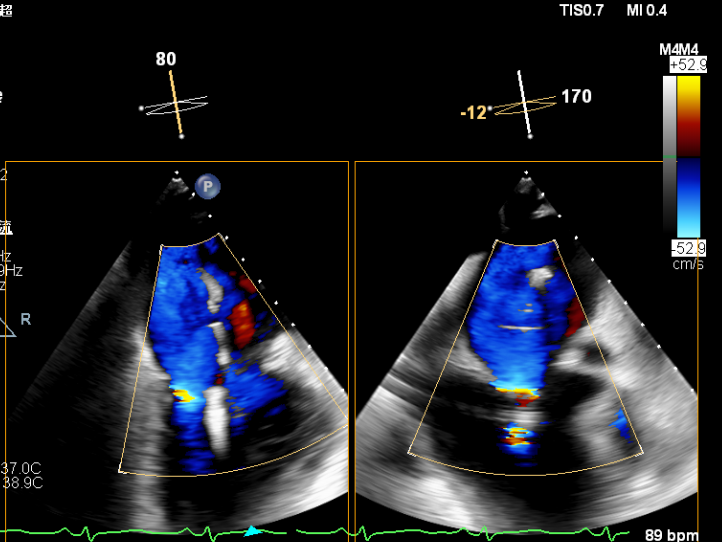 1.四腔心切面和二腔心切面可见左室高侧壁室壁瘤形成,二尖瓣瓣叶脱垂伴重度反流。