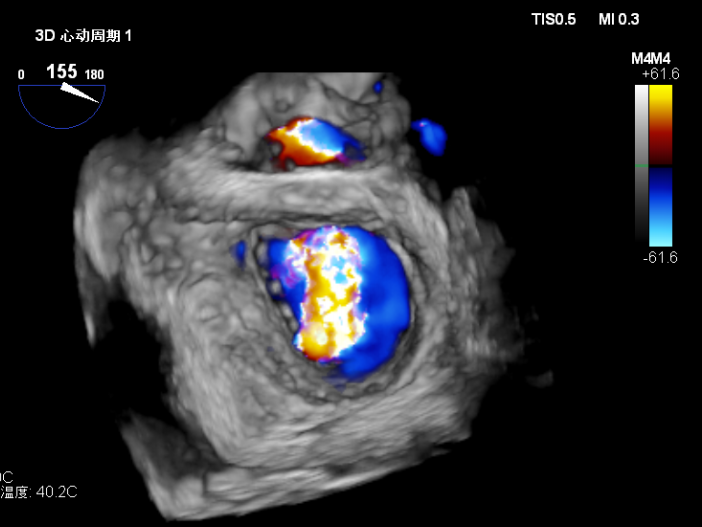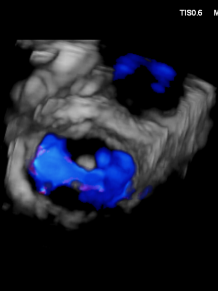 3D MV View: 二尖瓣前后瓣叶对合不全,A2/P2稍偏1区可见未闭间隙。PISIA主要来源于A2/P2区域。