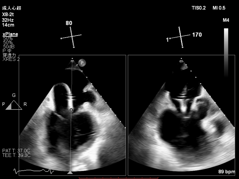 术后即刻超声提示二尖瓣反流下降至微量,二尖瓣平均跨瓣压2mmHg,多切面证实夹合组织充分,左上肺静脉多普勒波形由反向恢复正常。