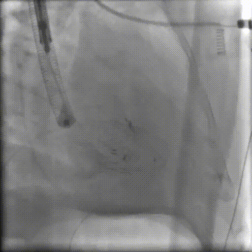 手术在全麻状态下进行,采用经右侧颈静脉入路,在TEE和DSA的指引下缓慢送入输送器进入体内,进入右室后释放室间隔锚定装置,旋转输送器,使得锚定装置对准室间隔面;释放前瓣夹持件,确定夹持件位于右室侧后释放人工瓣膜盘片,DSA及超声确认盘片位于右房侧,并适时调整瓣膜的同轴性。在DSA和超声的监视下调整室间隔锚定件贴合室间隔,释放室间隔锚定装置。再次确认瓣膜的稳定性和同轴性后,将输送器撤出体内,最终完成瓣膜植入(图4-5),手术室即刻拔除气管插管。术后超声提示人工三尖瓣同轴性良好,瓣架固定牢靠,无反流和瓣周漏,术后三尖瓣平均跨瓣压差显著降低。