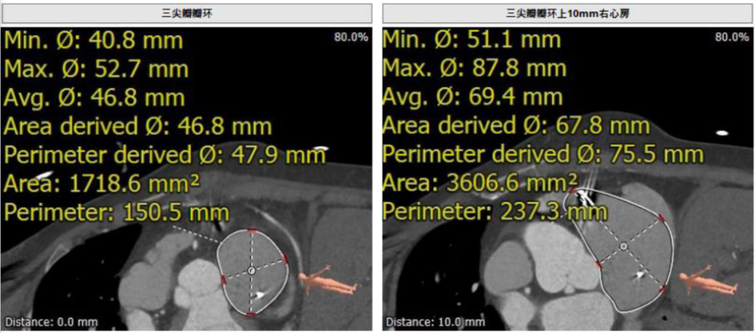 接受治疗的是三例重度三尖瓣反流患者,术前基础疾病多,均患有严重心律失常,其中两例患者NYHA心功能Ⅱ/Ⅲ级。结合术前CT评估结果,三例患者的自体瓣环都较大(图1-3),最大者平均瓣环为53.7mm;有一例患者有起搏器植入史,术中操作有缠绕起搏器导线的风险;三例患者入路血管均无严重迂曲和钙化。经术前讨论分析,潘湘斌教授及其团队潘家华教授、朱达教授、王首正教授以及心超室的骆志玲教授,董念国教授及其团队谢明星教授、尚小珂教授、陈澍教授、钟禹成教授经过讨论决定,采用创新的 LuX-Valve Plus经血管三尖瓣置换系统对患者进行手术。LuX-Valve Plus是我国自主研发的经血管介入三尖瓣置换系统,经颈静脉入路的微创方式可进一步降低对患者的创伤。