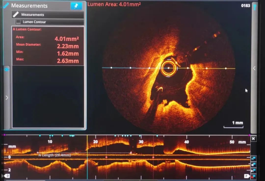 经过充分的术前准备,术前OCT检查提示:前降近中段钙化病变处可见90-360°环形钙化,钙化厚度约0.38mm-0.6mm,长度约10mm,局部可见钙化小结。较厚的环形钙化是导致上次手术使用高压球囊及切割球囊无法顺利打开病变的原因。针对病变特点,在OCT的精确定位下,启用3.5x12mm Shockwave冲击波球囊技术在环形钙化处精准震荡扩张,启动脉冲发生器,持续激发脉冲10S,可见球囊逐渐膨胀充分,随后以6atm扩张震波球囊,可见球囊扩张满意。重新定位冲击波球囊,重复脉冲3个周期共4个周期脉冲优化震波碎裂疗效,复查OCT清楚可见环形钙化斑块碎裂松解,局部未见明显夹层,获得较大管腔,满足支架植入条件。成功于左前降支近段植入3.5mm*13mm药物洗脱支架1枚。