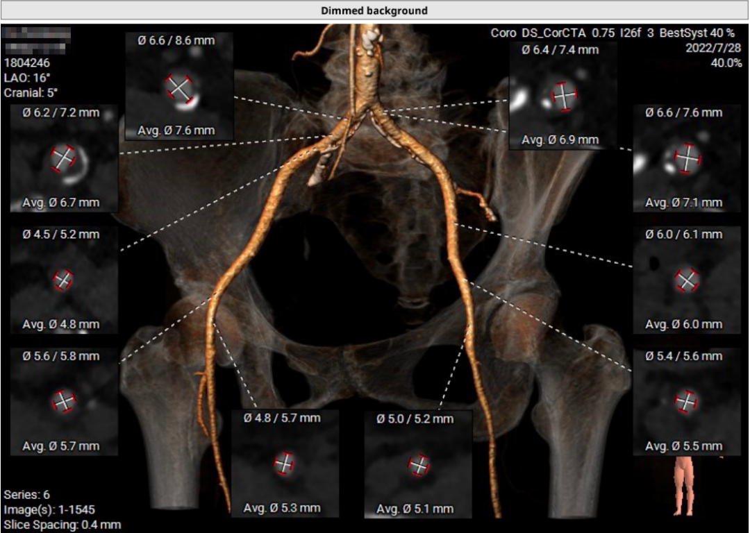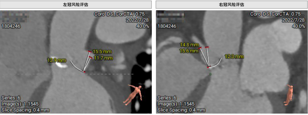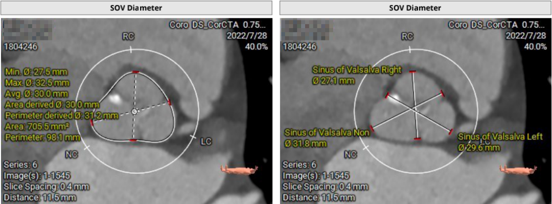 患者64岁男性,Type 0 型二叶瓣、横位心。主动脉瓣中度狭窄,重度反流,瓣环周长92.0mm,平均径29.0mm。LVOT周长98.7mm,升主扩张,窦部结构极限,锚定能力极限。入路两侧血管轻度迂曲,分叉高度可,两侧血管内径均>8mm。