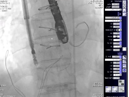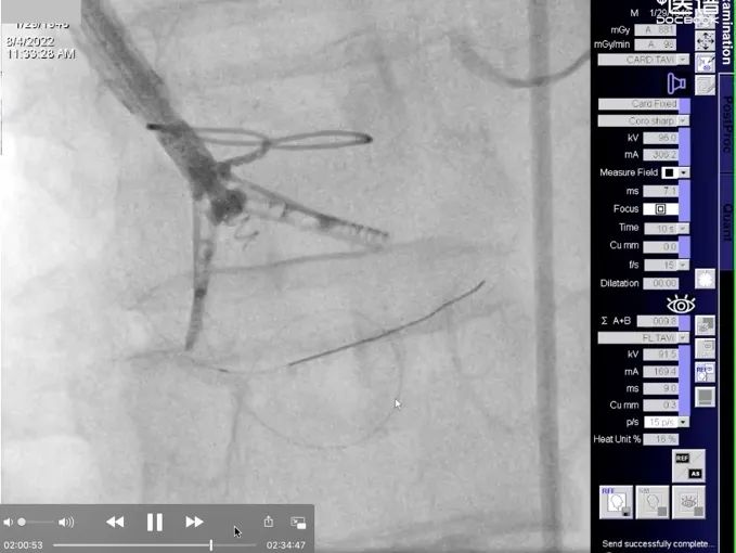 患者全麻后,右侧颈静脉穿刺,将K-Clip®输送系统送达右心房内。在超声医生指引下,对K-Clip®的输送系统进行调姿,将K-Clip®锚定到位。