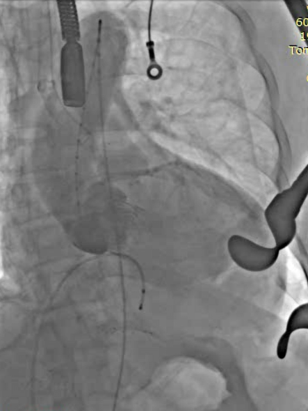 全麻后取仰卧位,消毒。取左前胸第5肋间切口进胸,腔镜辅助下游离左侧乳内动脉(LIMA)备用。肝素化。显露左前降支动脉(LAD),于其狭窄远段切开,将LIMA与之端侧吻合。血管桥排气后开放,测桥血流量满意。经股静脉植入心脏临时起搏器并确认正常工作。经股动脉置入造影导管至升主动脉根部,造影显示主动脉瓣大量反流,窦部结构可。3-0 Porlene线带毛毡片做荷包,经单弯导管引导超滑导丝至降主动脉,更换加硬导丝,导丝尖端于髂动脉分叉处。置入带主动脉瓣输送系统,造影定位下,准确释放29# J-Valve至主动脉瓣瓣环处,造影显示左右冠脉血流正常,TEE证实瓣膜位置可,未见明显反流。撤出输送系统,收紧荷包并缝合止血。放置胸管,逐层关闭各切口。