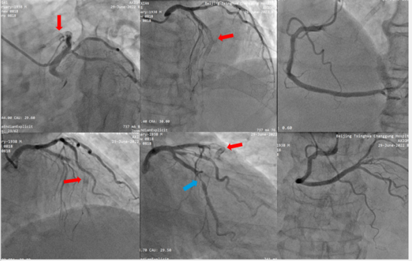 冠脉造影提示:前降支(LAD)支架内完全闭塞(红色箭头),前向血流TIMI 0级。回旋支(LCX)中段狭窄80-90%(蓝色箭头),钝缘支近端狭窄80%。右冠脉(RCA)未见明显狭窄病变。(图2)