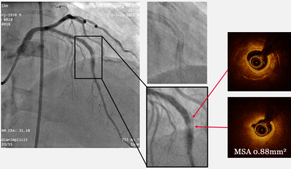 随后,我们选择3.0*12mm Shockwave冲击波球囊通过LAD支架内再狭窄伴钙化病变部位,根据标准操作流程,球囊压力充盈至4atm,先后触发80次脉冲击波(8个周期),实施钙化斑块碎裂术,并间断将球囊充盈压升至6atm维持10秒左右,对治疗段进行低压球囊扩张成形,随后通过OCT及冠脉造影融合技术证实, MSA:1.85mm²,支架内钙化环被打开,震波深达0.52mm,换用3.5*15mm NC 耐高压球囊以20-24atm扩张后,测得MSA:3.21mm²,扩张仍然不理想。介入团队经商定后,决定更换3.5*12mm Shockwave 冲击波球囊再次进行8次周期的斑块碎裂术,事后以3.0-3.25-3.5mm NC球囊高压充分高压扩张,通过OCT证实MSA达到4.56mm²(如图6,7)。造影提示支架内血流通畅,残余狭窄<10%,前向血流恢复TIMI 3级,最终结果如图8。患者术后胸痛症状明显缓解,安全出院。