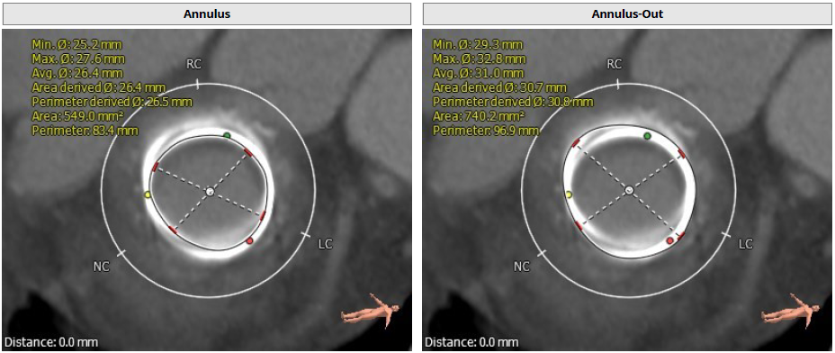 1. 二尖瓣生物瓣换瓣术后:原生物瓣金属环周长折算内径26.5mm,外径30.5mm(金属环存在重建错位),瓣架高度20.6mm;