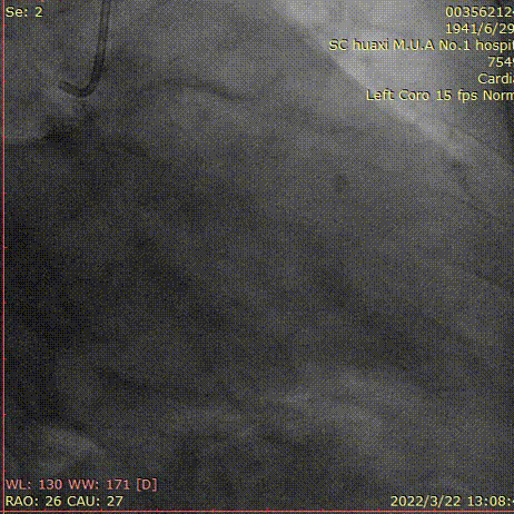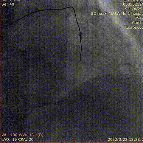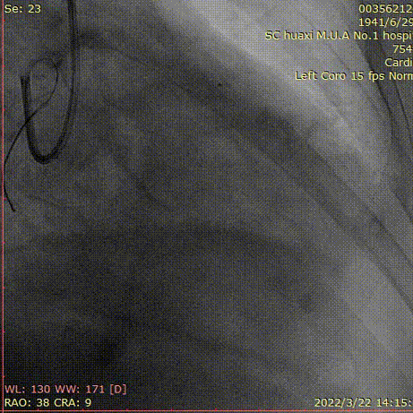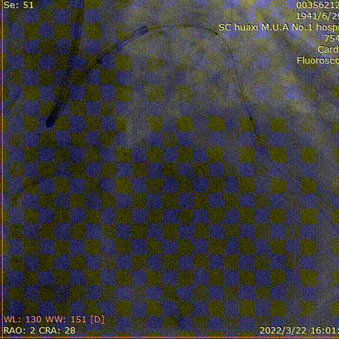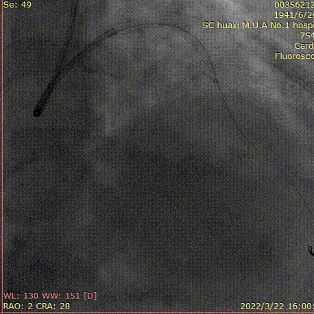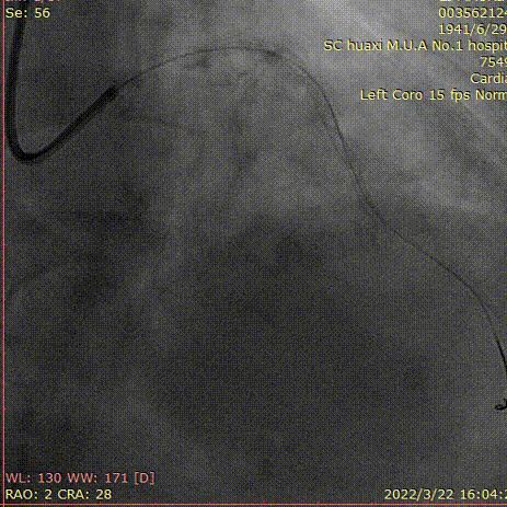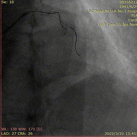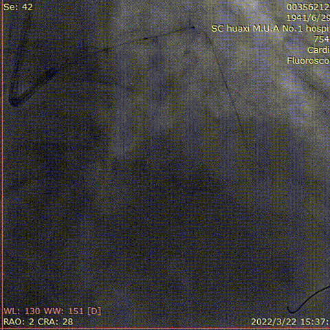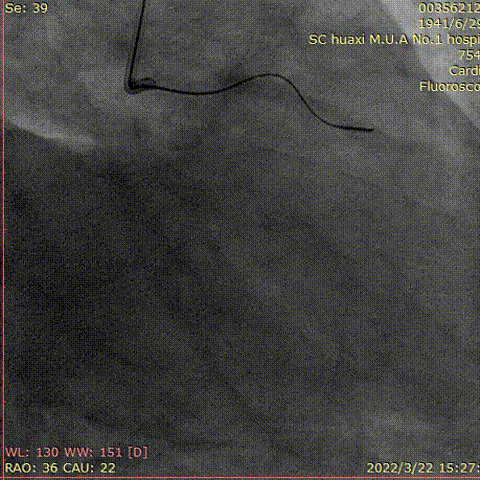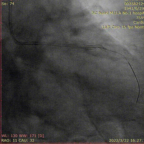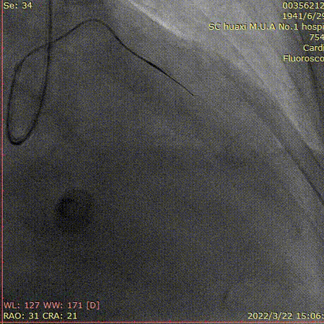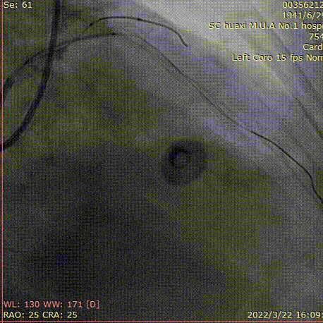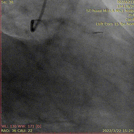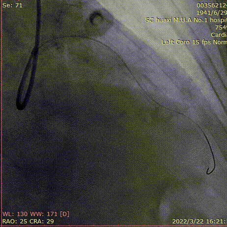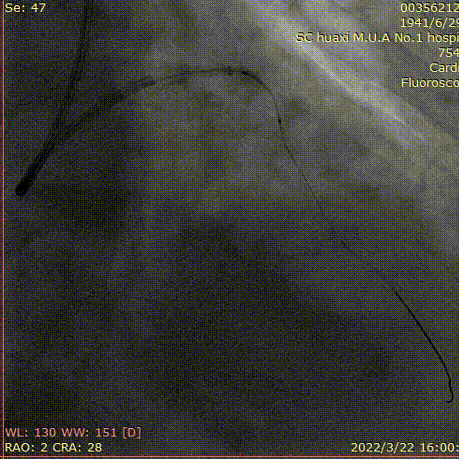 说明:CP穿刺成功,交换为工作导丝,2.5球囊扩张前降支。