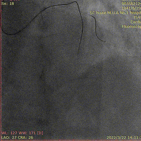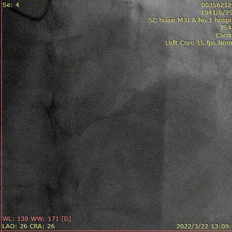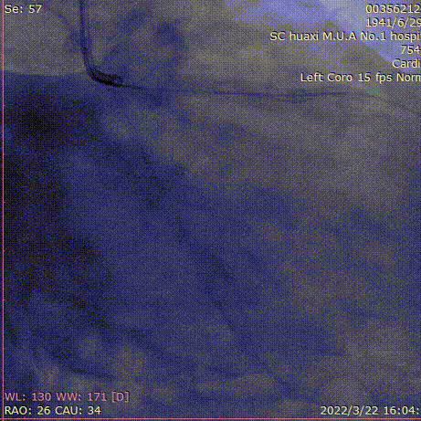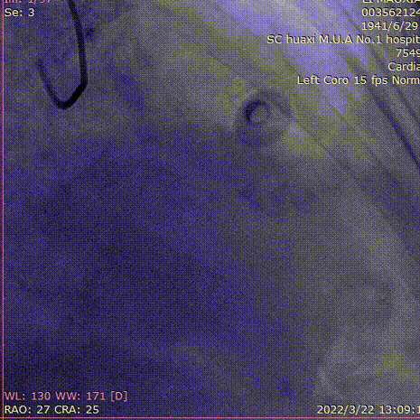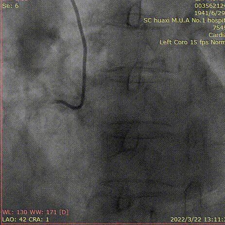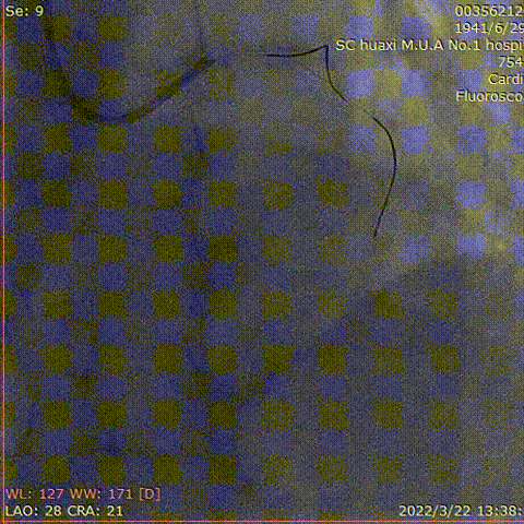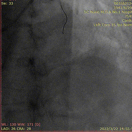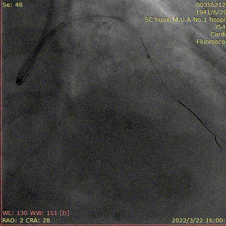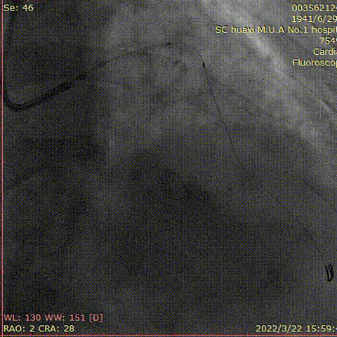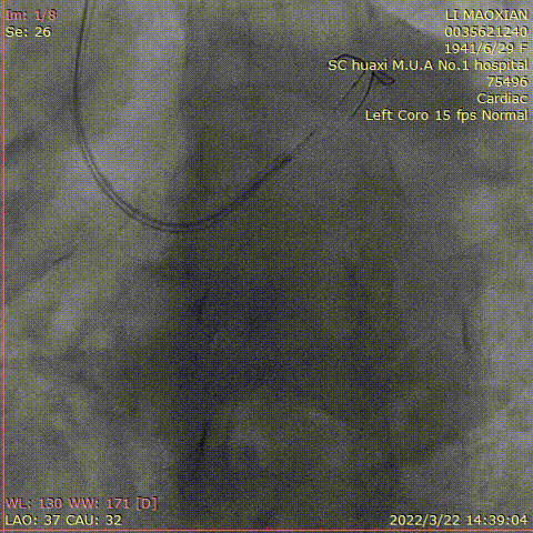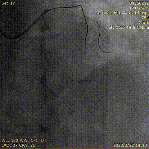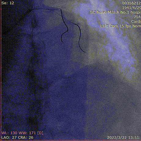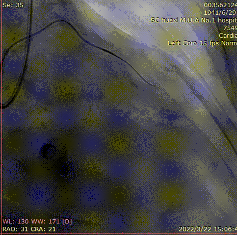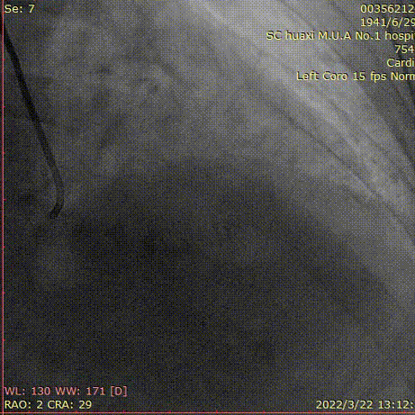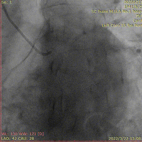 说明:CP穿刺成功,交换为工作导丝,2.5球囊扩张前降支。
