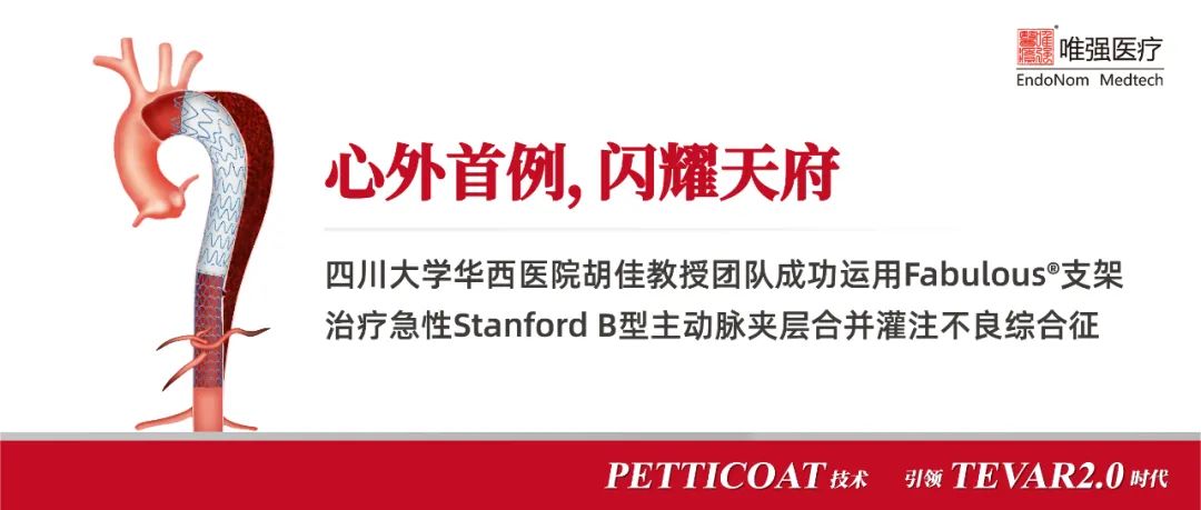 近日,四川大学华西医院心脏大血管外科胡佳教授团队成功为一名急性主动脉夹层合并灌注不良综合征患者植入Fabulous®胸主动脉支架,利用PETTICOAT技术修复胸主动脉夹层,并且显著改善远端血供,纠正脏器灌注不良。