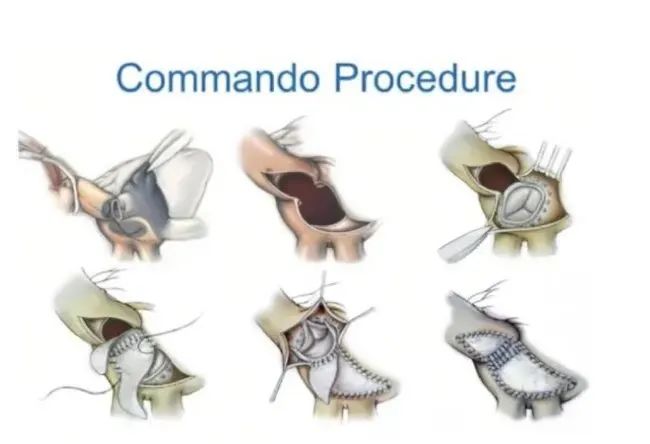 Commando手术首次报道是在1997年,最早由David TE医生应用于治疗感染性心内膜炎。该手术的过程通过切开整个主动脉根部以及左房顶,重建主动脉幕帘后进行双瓣置换(见图2)。Commando手术难点在于需用人工补片重建主动脉根部、主动脉瓣环、主动脉幕帘以及左房顶、二尖瓣瓣环,术中需要仔细缝合,预防难以控制的出血,并且术后并发症较多。因此,Commando手术在医疗界的心外科是一种高难度的瓣膜手术之一,国内能够常规开展类似手术的医疗中心不多。