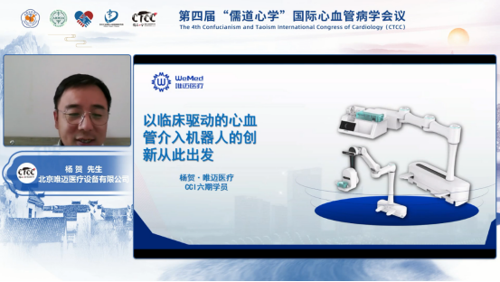 北京唯迈医疗设备有限公司总经理、CCI六期学员杨贺基于介入的三大临床痛点,介绍了所做的心血管介入机器人,该机器人采用无射线工作环境,具备仿生学导丝控制,多维导丝触觉感知,磁吸式快拆盒等多个创新设计,将介入医生的“手感”变为量化数据,未来将打造与DSA影像设备深入融合的一体化介入诊疗平台,研发AI智能导航技术和5G远程控制技术。