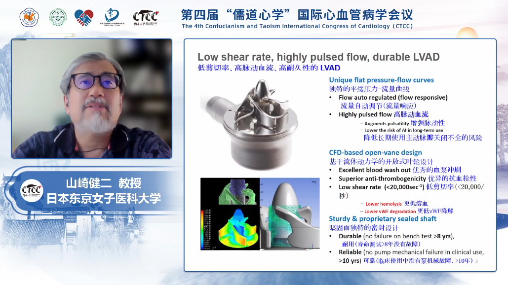 目前最成熟并且商品化了的人工心脏发明人山崎健二教授介绍了第三代液力悬浮人工心脏EVAHEART的设计、研发及临床应用,也是上半场最大的亮点。永仁心EVAHEART心室辅助装置采用日本精工工艺制作,安全性高,术后一年生存率100%。是中国目前仅有的一款获药监局批准可用于长期治疗的人工心脏。和磁悬浮产品相比,EVAHEART具有独特的流道设计和叶轮设计,可产生高脉动性,让植入的患者仍然保留脉搏。该款产品叶轮效率高流量大,仅需要每分钟1600-1800转即可满足患者需求,远远低于磁悬浮血泵3000以上的转速,大幅度降低血液细胞的破坏。除此之外,血液泵内部涂有仿生MPC涂层,模拟血管内皮细胞,减少血栓黏附。目前,在日本最长使用时间已经达到了11年。目前,两代产品在中美两国的临床试验中都取得了极好的临床效果。这种优秀的产品无疑对广大终末期心衰的患者是个福音,在心脏移植前无疑能作为很好的过渡。