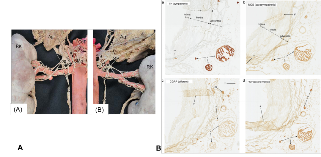 图1.A组显示了人右肾的肾交感肾丛。(A)前视图和(B)后视图。Ag(肾上腺),Arg(主动脉神经节),Coe(腹腔神经节),CoT(腹腔干),Ig(肾下神经节),LC(腰神经对肾丛的分支),Pg(肾后神经节)、RK(右肾)、SMg(肠系膜上神经节)、SP(胸内脏神经)。