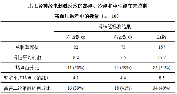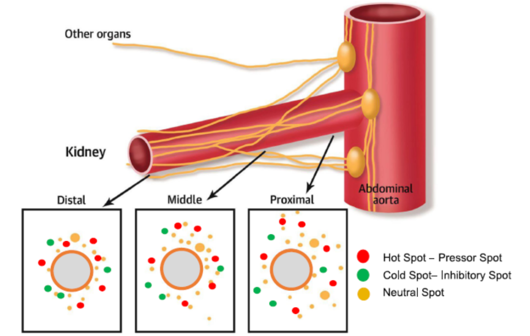 在进行RDN手术过程中,会进行肾神经标测和选择性去除肾交感神经。肾神经冲动会以 15mA,20 Hz和5ms的脉冲刺激传递60s,在 8-10 瓦和 50℃下消融热点需要两分钟。当对同一部位进行再次刺激时,如果仍然出现明显血压变化,说明该位点的肾交感神经去除不彻底,需要进行二次消融。