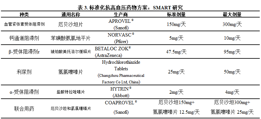SMART研究是前瞻性、多中心、单盲的随机对照试验,对于拟入组的所有患者都要获取其知情同意,患者有权决定是否进入筛选过程。在筛选期间,患者在接受至少28天的标准化降压药物治疗后,如果血压仍≥150mmHg且≤180mmHg,则符合纳入标准。这些患者将进行肾动脉血管造影,并按照1:1的比例(220 名患者,110 对)随机分配到去肾神经术组或肾动脉血管造影组。在RDN手术治疗三个月后,根据预定义的标准化用药综合指标,对血压未达到理想水平(<140 mmHg)的患者调整降压药的剂量和类型,直至血压低于140mmHg。所有药物均由研究申办方(苏信迈医疗有限公司)提供,抗高血压药物调整只能从标准化用药方案中选择(表3)。