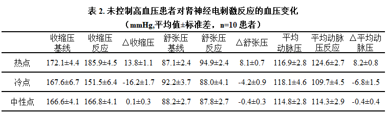 显而易见,人体内血压的变化模式比动物更为复杂。然而导致这些变化模式的潜在机制尚未完全清晰,仍需要进一步研究揭示。分析和区分这些血压对肾脏刺激反应的变化模式将有助于术者确定神经类型并有选择地对交感神经主导的部位进行消融。