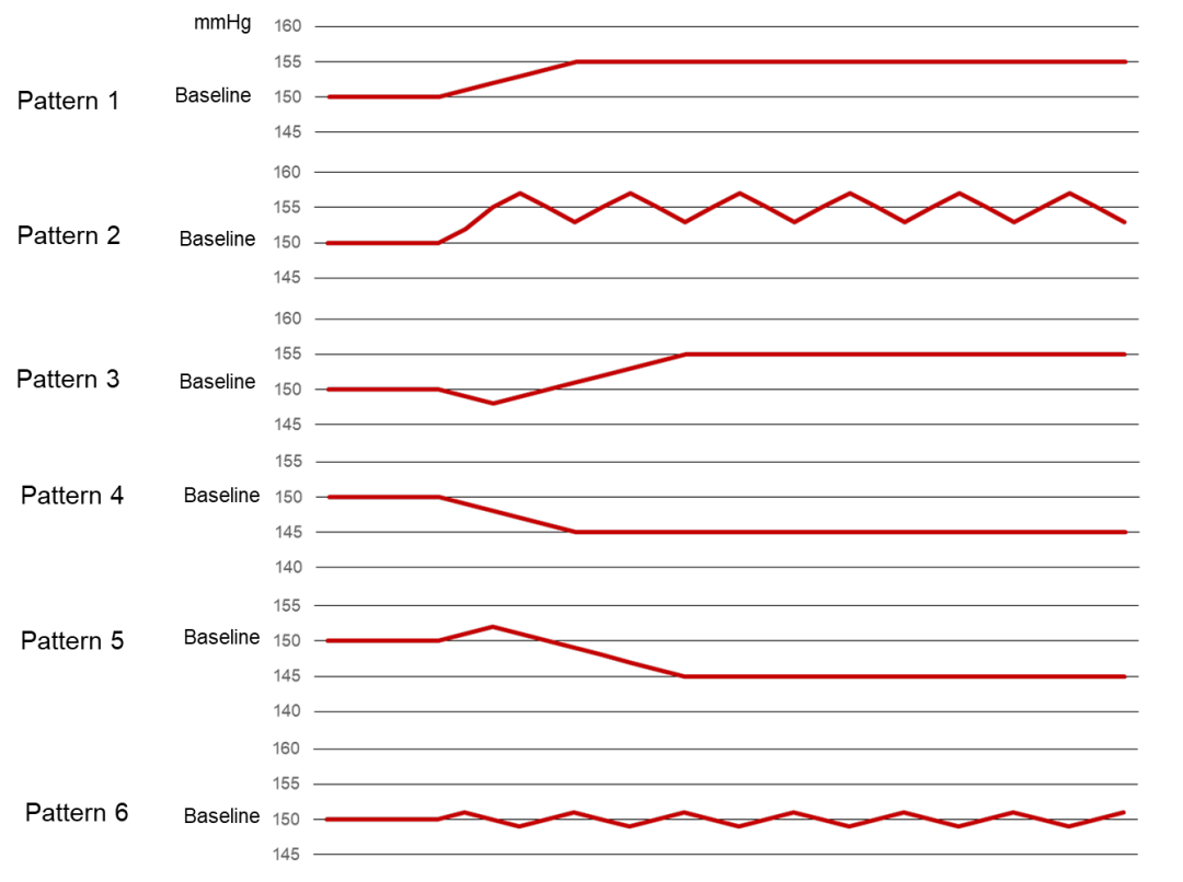 Pattern 1: SBP is directly increased from baseline and maintained at an elevated level. This pattern is easily assessed as a hot spot and needs to be ablated.