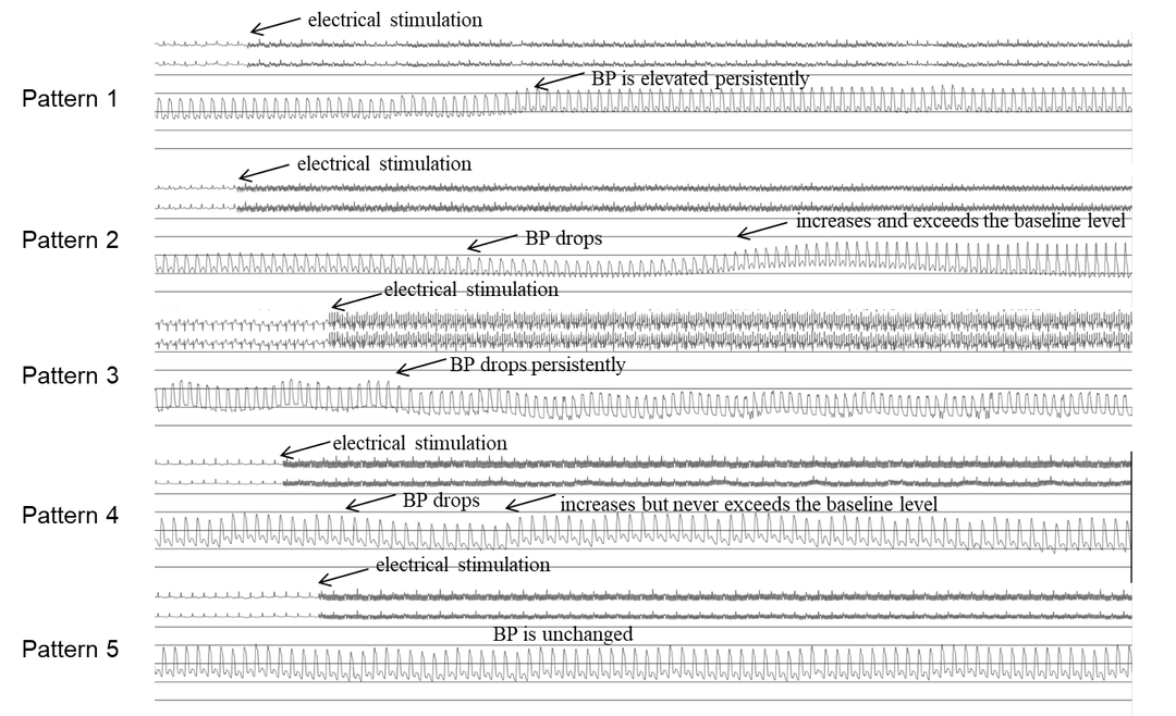 Pattern 1:BP immediately increased to its plateau in responses to renal nerve stimulation, maintained at a steady and elevated status during the stimulation, indicating that the renal sympathetic nerve is dominant in this site. We presumed that electrical stimulation signals were transmitted to the central nerve system (CNS) via afferent fibers and increased central sympathetic activity, leading to an increasing central sympathetic output to the entire body. It caused a series of physiological effects, including peripheral vasoconstriction, increases in myocardial contractility and cardiac output, resulting in BP elevation. Efferent nerve fibers in the same bundle were also captured by electronic simulation; the efferent sympathetic signals to kidneys participated the elevation of BP by renal artery contraction, release of renin from juxtaglomerular cells, and by increasing tubular sodium and water reabsorption. Overall, this pattern of BP response represents a hot spot and an ablation is needed.