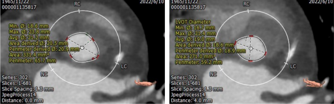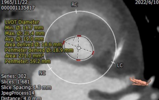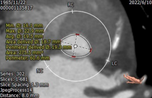 患者瓣环周长65.7mm;平均直径21.2mm;LVOT周长59.2mm;平均直径19.0mm;