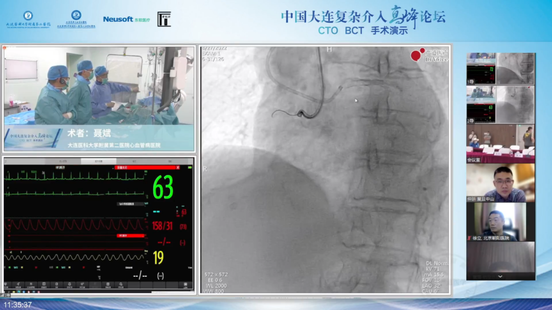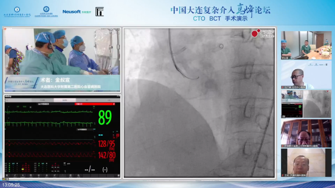 葛均波院士带领团队成员复旦大学附属中山医院陆浩教授和大连医科大学附属第二医院心血管病医院孙飞教授首先演示了一例既往三次PCI失败的前降支和右冠完全闭塞伴重度钙化的82岁高龄高难度CTO病例,拉开了一整天手术演示的帷幕。