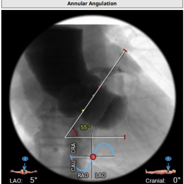 ● 预装AV26瓣膜,瓣环上2~4mm定位释放,释放角度RAO18° CAU29°(左右重合位)左右,释放后调整至左冠切线位LAO7° CRA3°左右进一步评估冠脉灌注、瓣膜稳定性及展开形态后释放;